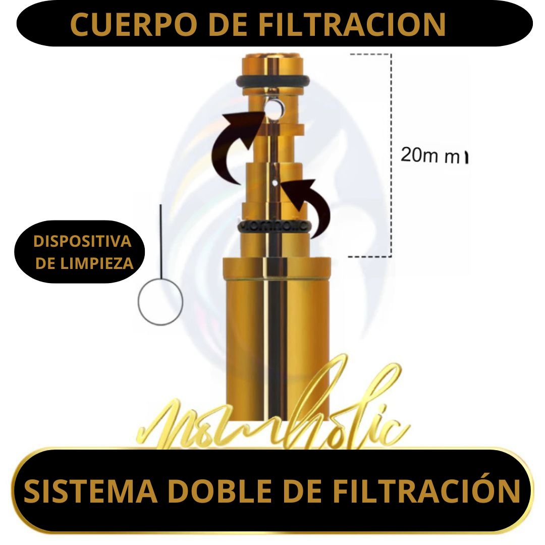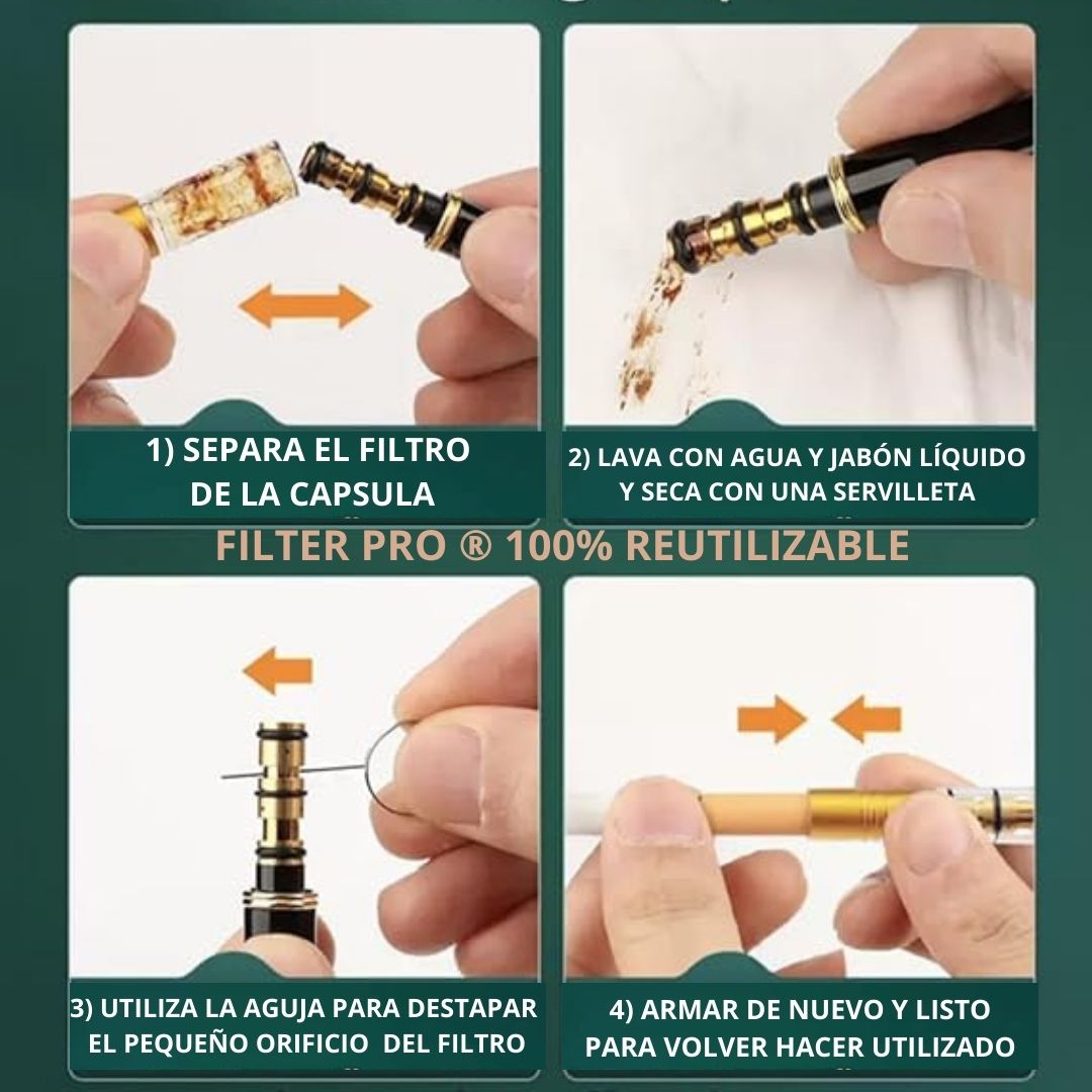 El FILTER PRO® cuenta con un sistema doble de filtración diseñado para capturar una mayor cantidad de nicotina, alquitrán y toxinas antes de que lleguen a tu cuerpo. Su estructura interna optimizada trabaja en dos etapas para ofrecerte una experiencia más limpia y mucho menos dañina.